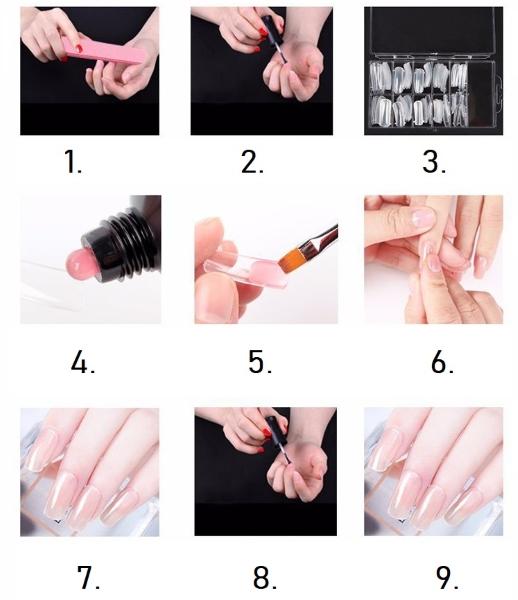 Под изкуствения нокът нанесете тънък слой poly gel, който ще прилепите след това на своя нокът. Просто отлепете изкуствения нокът, след като се изсуши под LED лампата.
