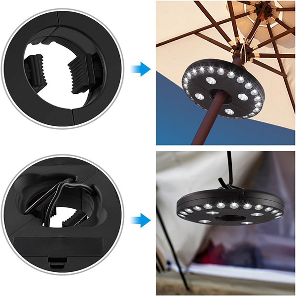 За разлика от стандартните светлини за чадъри, BRELLAGLO работи навсякъде, където ви е необходимо. Закрепете го на чадър за осветление на терасата или използвайте вградените куки за окачване—идеално за къмпинг и приключения на открито.